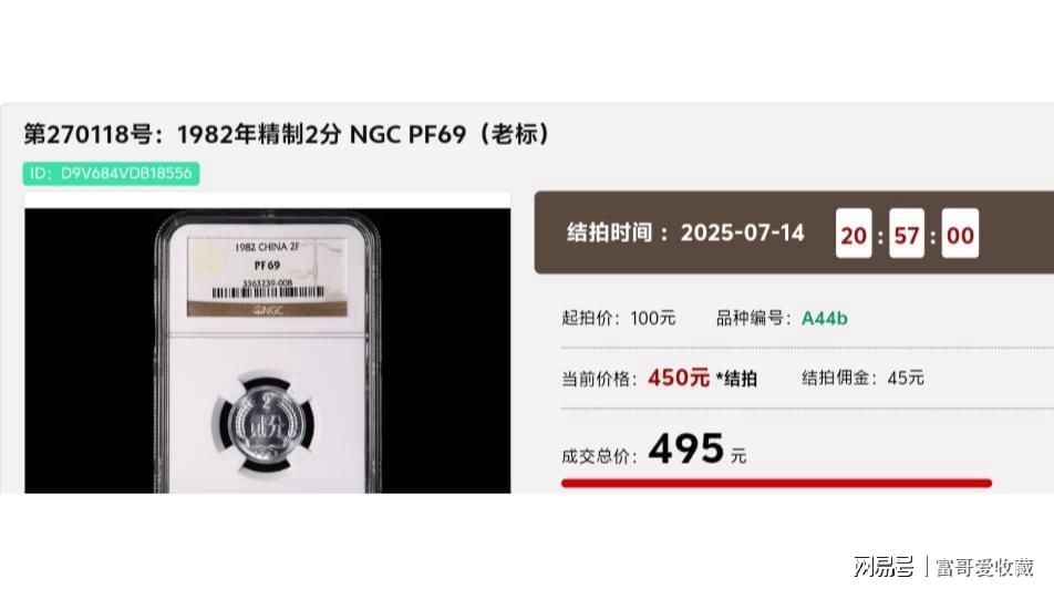 在2025年7月14日的“春秋大拍”中,一枚(老标)1982年的精制“2分硬币”,其NGC评级分数达到了69分,最后拍出了495元!