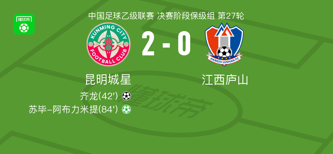 北京时间9月27日,中国足球乙级联赛决赛阶段保级组第27轮展开较量,昆明城星在主场迎战江西庐山。比赛中,孙智轩送出助攻,齐龙接球后冷静施射破门,为昆明城星先拔头筹。随后,苏毕-阿布力米提在点球点上稳稳将球罚进,进一步扩大领先优势。最终,昆明城星以2-0战胜江西庐山,全取三分。