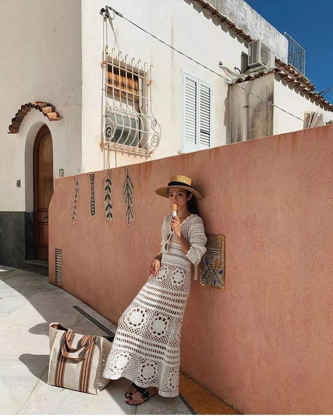 这种长款的蕾丝镂空小白裙很有波西米亚风情,超级适合去海边度假穿搭。