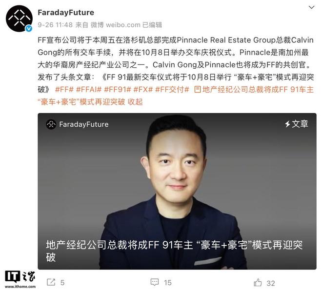 IT之家 9 月 28 日消息,法拉第未来(Faraday Future,FF)宣布公司将于 10 月 8 日正式交付下一台 FF 91 2.0 Futurist Alliance,车主为 Pinnacle Real Estate Group 总裁 Calvin Gong。Pinnacle 是南加州最大的华裔房产经纪产业公司之一。Calvin Gong 及 Pinnacle 也将成为 FF 的共创官。