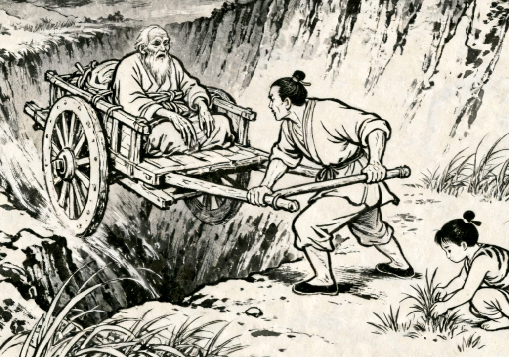 孙三却越想越窝火:这老东西断了腿,就是个废人了,白吃白喝不说,还占着地方,不如趁早处理了干净。他瞅着院角那辆破轱辘车——那是他爹年轻时用来拉庄稼的,木头都朽了,轮子上的辐条断了两根,平时扔在那儿积灰。孙三忽然起了个歹念:用这车把老东西拉到后山沟里,扔了!