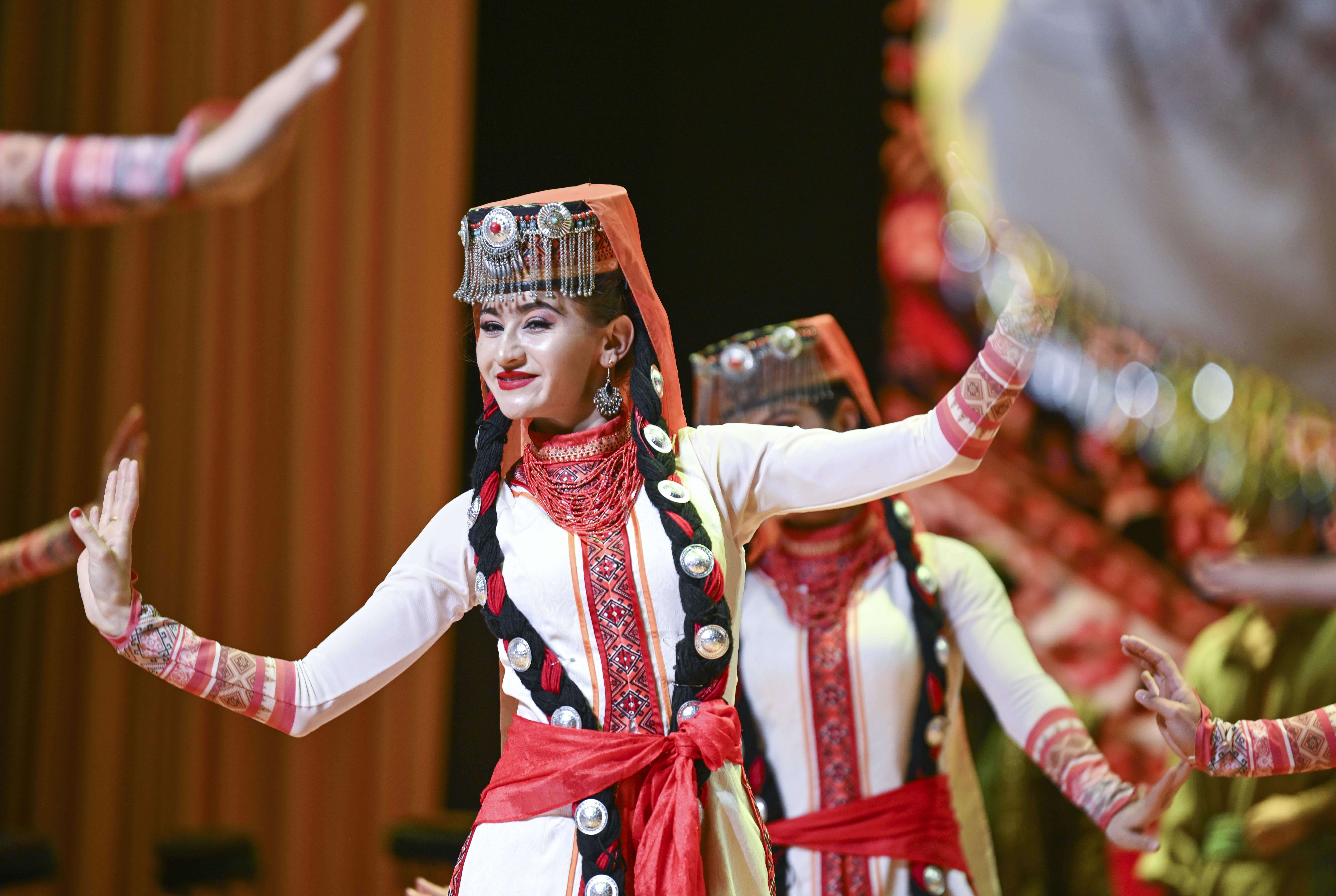 在由喀什开往成都西的列车上,艾尔开牙·多力开与民间艺人一起为乘客跳舞(2024年4月19日摄)。