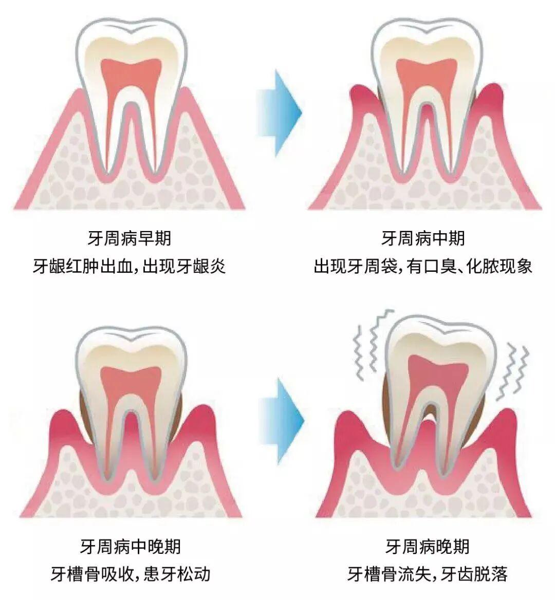 牙周炎:若牙龈炎没及时处理,炎症往下蔓延便会出现牙周炎。除了牙龈出血,还会导致牙龈萎缩、牙齿松动,甚至牙齿脱落。