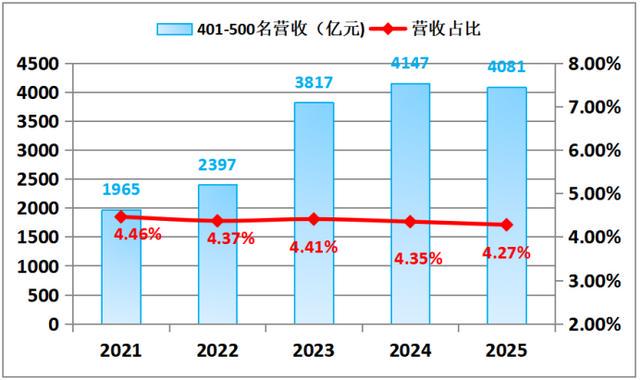 401-500名企业的总营业收入为4081亿元,比上年的4147亿元减少66亿元,下降1.59%;其营业收入占比为4.27%,比上年的4.35%减少0.08个百分点(见图17)。