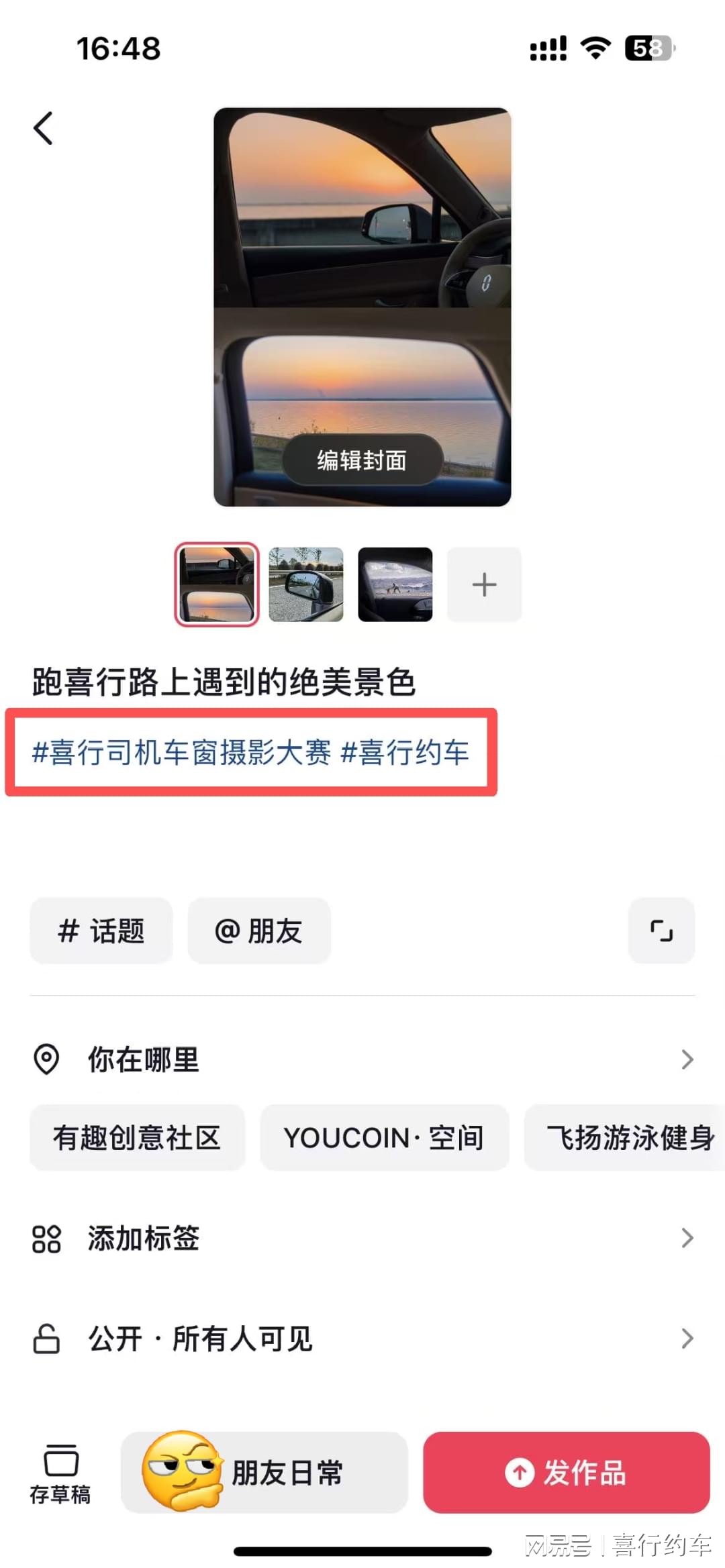 添加#喜行司机车窗随手拍 #喜行约车 话题即可参赛