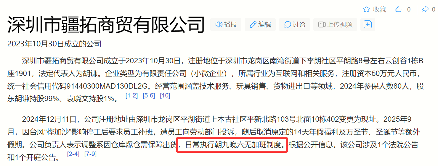 网友搜了一下,这家公司成立时间不久,在2023年10月份才成立。虽然是商贸公司,但并践行九九六,而是朝九晚六无加班制度,可以说是公司里的一股清流。