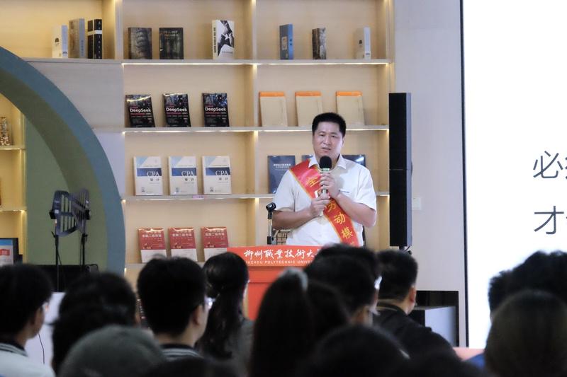 全国劳模、广西柳工机械股份有限公司传动件公司制造总监、特级技师庞淇文以《以匠心守初心 以学习拓新境》为主题,讲述了自己从数控操作工到掌握2000把刀具、实现5微米精度突破的技术攻坚之路。他通过多项技术突破和创新成果,阐释了“干一行、爱一行、专一行”的职业信念,并寄语同学们要保持学习热情、勇于突破技术瓶颈、坚守工匠初心。