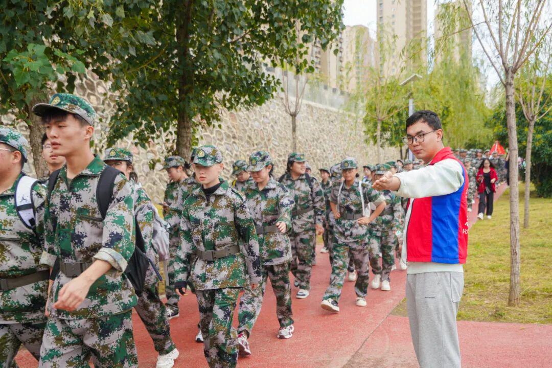 上午8时,清点人数,整顿队伍,新生集结完毕。随着团长的一声号令,“部队出发”,新生迈着铿锵有力的步伐踏上征程。队伍如长龙般蜿蜒而出,队旗引领,口号响亮,坚定的脚步声在秋日校园里回荡,展现出新时代学子昂扬的精神风貌。