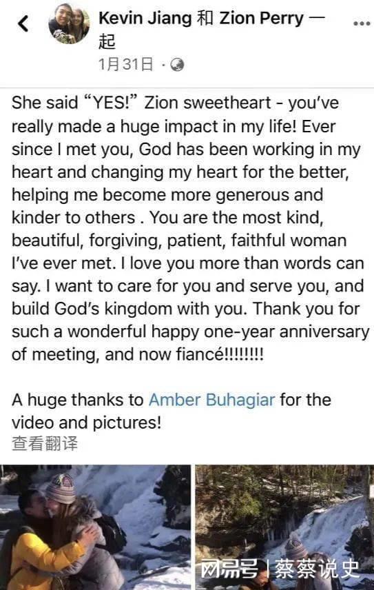 佩里则写道:我真的很感谢上帝把你带进了我的生活,蒋凯文!我很幸运认识你,并与你一起在基督里成长。上帝允许我们在教堂相遇,然后开始约会,即使是在疫情。我爱你!我也很激动地宣布,一周后我将在耶鲁开始攻读生物科学博士学位!只有上帝保佑,这种事才会发生。我很幸运能得到所有远近朋友的支持(请保持联系!)还有我可爱的妈妈、爸爸、哥哥和奶奶!
