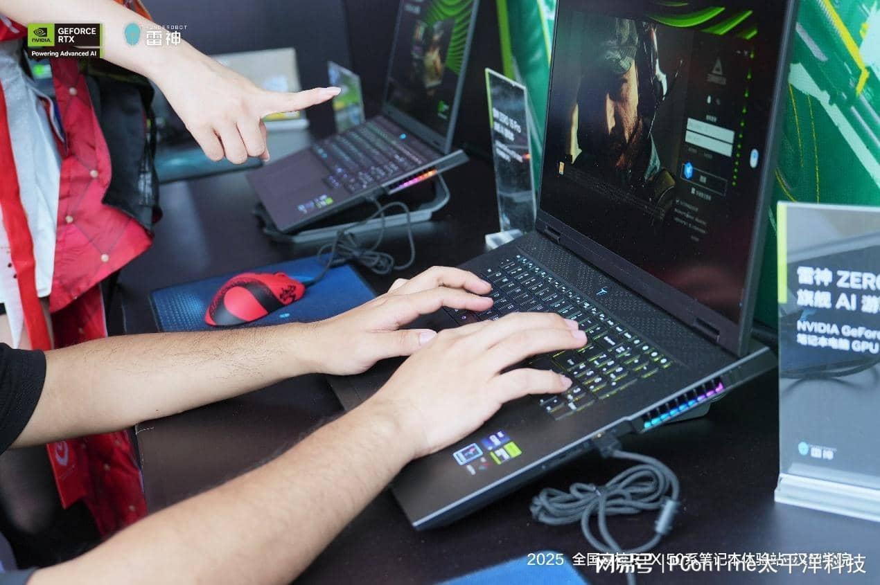 本次活动的核心,无疑是陈列在体验区的一系列搭载NVIDIA GeForce RTX™ 50系列GPU的雷神笔记本电脑。这些“性能猛兽”不仅拥有强悍的硬件配置,更代表了当前AI PC的顶尖水平,吸引了在场所有人的目光。
