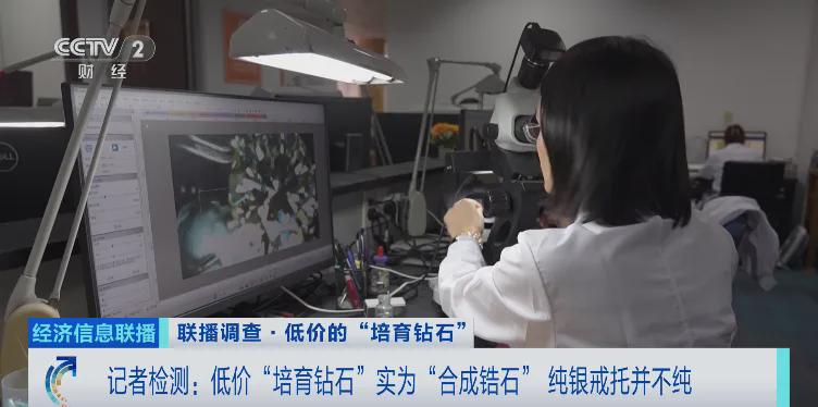 在浙江杭州黄金珠宝饰品质量检验中心,工作人员将记者在直播间内购买的两枚单价在150元的号称是培育钻石的戒指进行了检测。