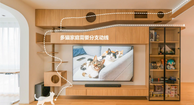 在餐厅和电视的角落,巧妙地安置猫爬架,这不仅是猫猫的小玩具,更是它们前往猫过道的便捷通道。