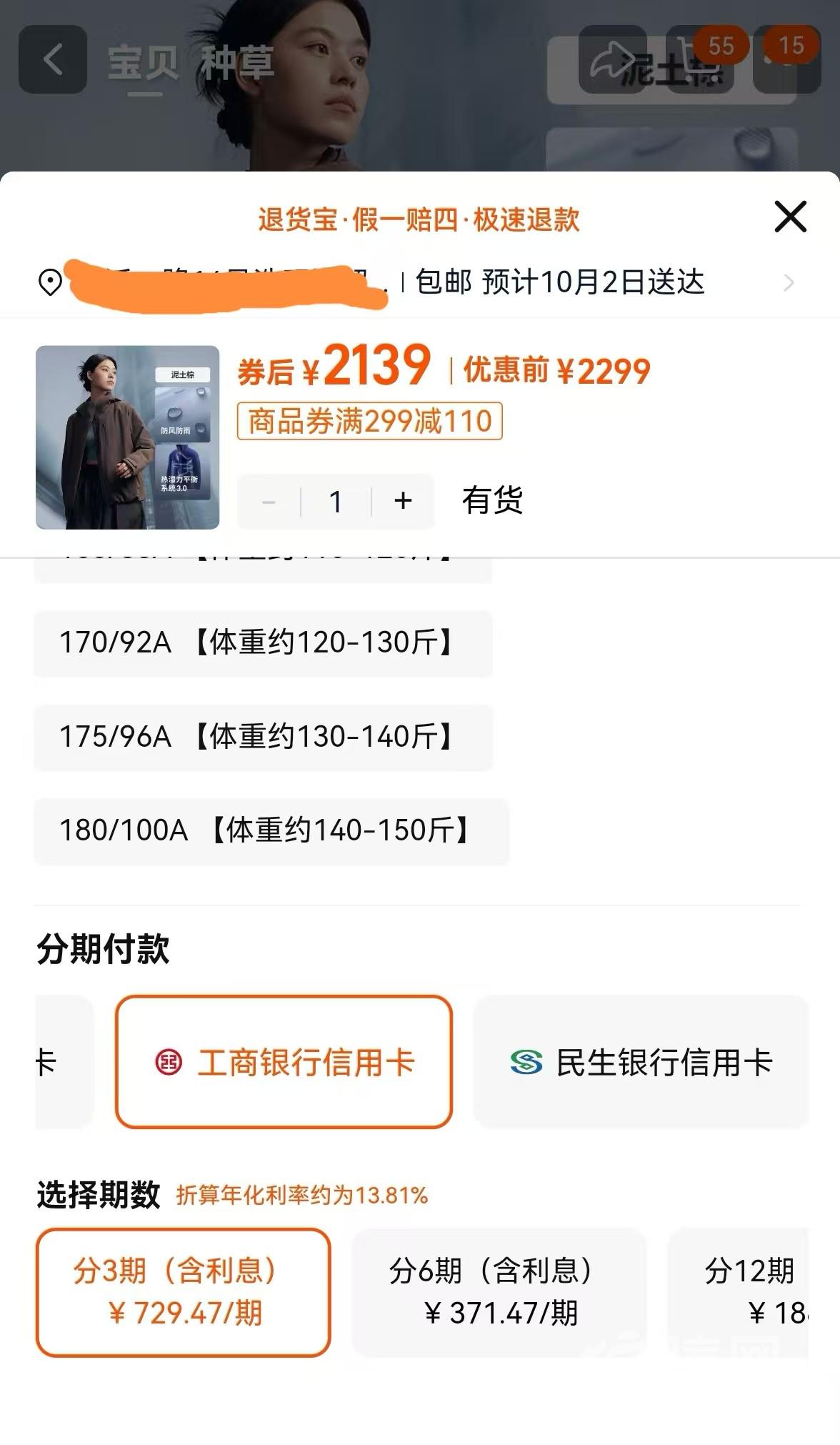 在手机淘宝上选择工行分期付款,并没有退货不退利息的明显提示。(来源:网络截图)
