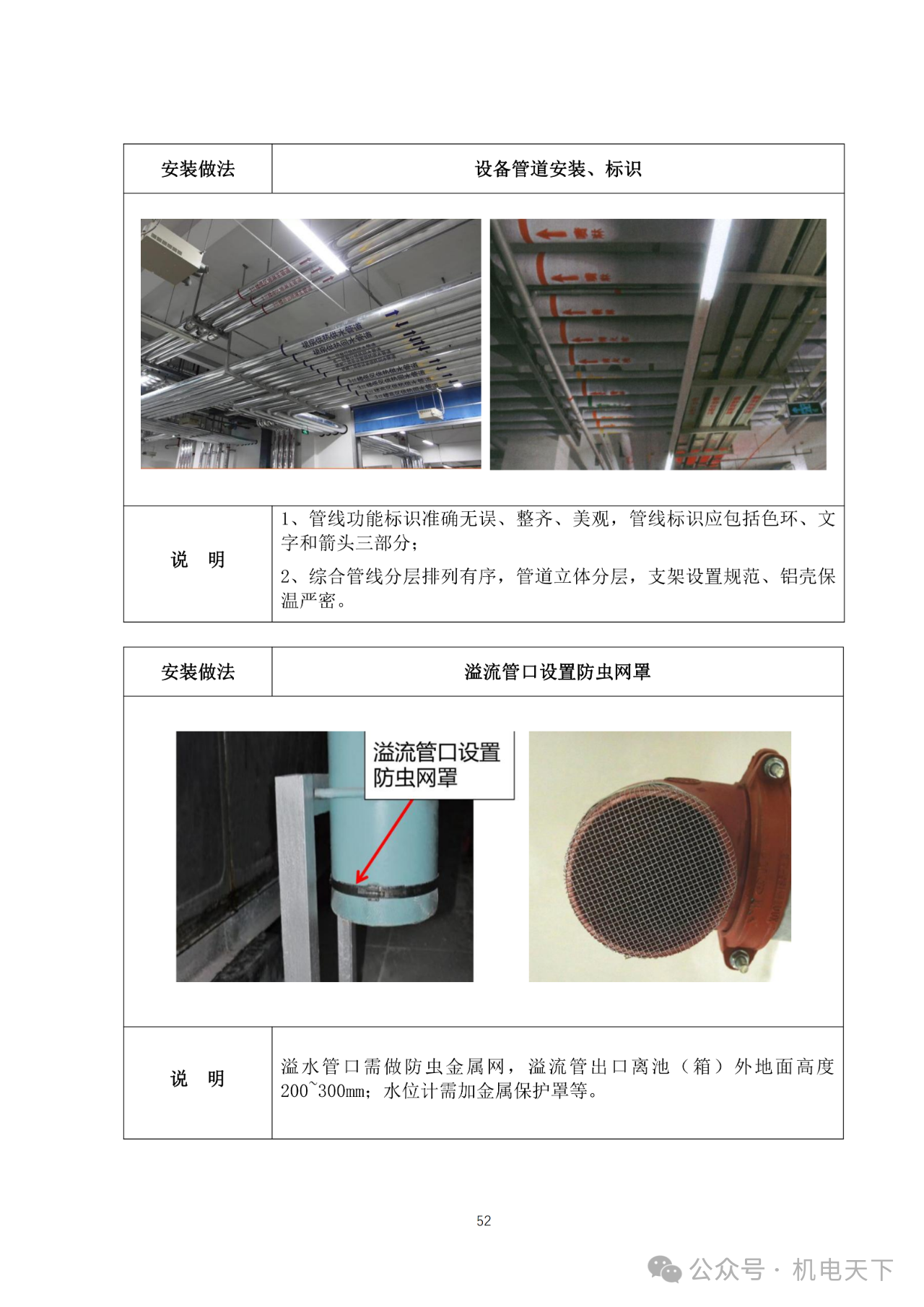 其中机电工程部分目录包括:设备基础排布、变配电室、消防水泵排布、法兰螺栓(保护帽)、湿式报警阀组排水装置、设备管道、设备管道保温及标识、水力警铃安装、设备管道安装及标识、溢流管口设置防虫网罩、工业化成品支吊架、水暖管道吊架、设备管道排布、管道穿楼板安装、管道穿墙、风管(桥架)穿墙及穿楼板、管道“U”型卡环固定、管道封堵、通风管道安装、消防设施安装、接地标识、设备接地、线缆安装、电箱安装、明配管、箱内配线安装、等电位箱配线安装、等电位箱、桥架跨接、灯具安装、避雷带、防雷接地、避雷测试点、面板安装、设备基础排水槽、变配电室地面、变配电室透明地面检修口、变配电间挡鼠板、卫生器具安装等。