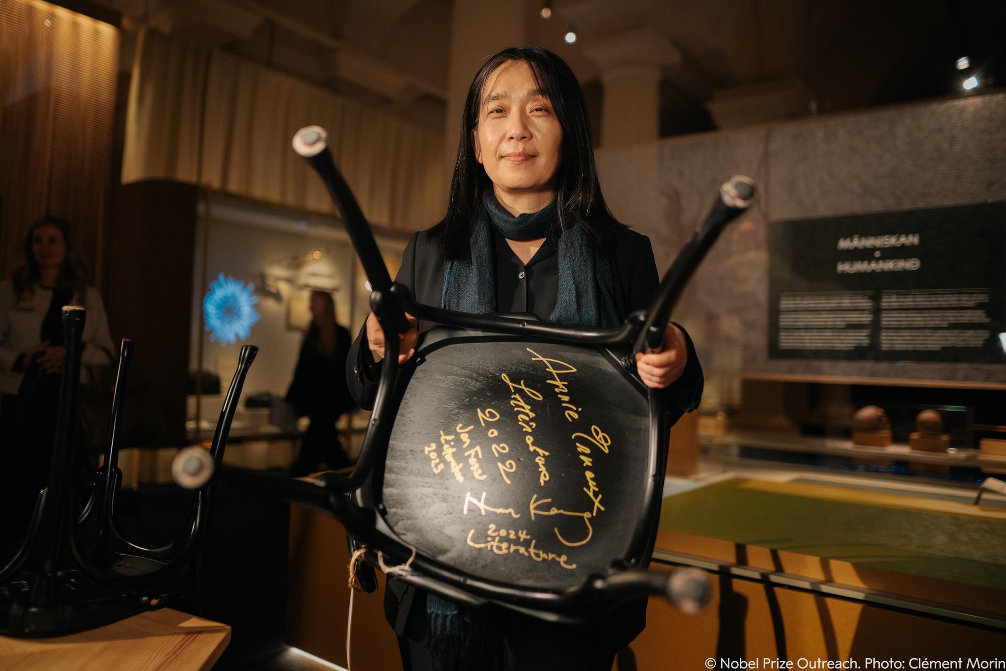 2024年12月7日,诺贝尔奖博物馆的椅子签名环节,韩江在此前两位获奖者安妮·埃尔诺、约恩·福瑟签名旁签下自己姓名。(图片来源:诺贝尔奖官网)
