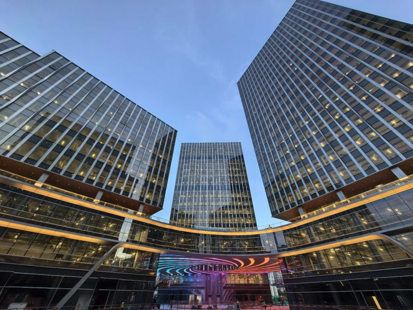 据悉,晶耀虹桥项目位于上海市长宁区金虹桥商务区,由铁狮门公司联合新长宁集团、三菱地所合作开发,总投资80亿元,总建筑面积24.9万平方米,含16万平方米办公空间、2万余平方米商业配套,由五栋连通甲级办公楼组成。目前,项目主体结构及幕墙已完工,机电安装收尾进度达98%,预计10月底完成所有验收准备。