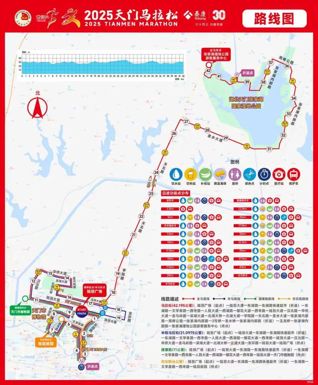 3、健康跑(11公里):陆羽广场(起点)—陆羽大道—东湖路—东湖路快递超市(折返)—东湖路—文学泉路—西寺路—人民大道—西湖路—樱花大道—西寺路—陆羽大道—天门市植物园(终点)