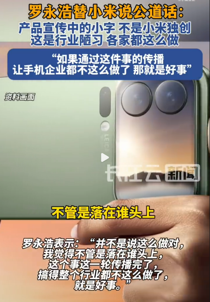 罗永浩称手机厂商「小字」宣传是普遍陋习,这反映了怎样的行业现状?【#罗永浩替小米说公道话##罗永浩说小字是行业普遍陋习#】近日,罗永浩在一场直播中提到了产品宣传中的小字,他表示:“很多人在拿这个黑小米,其实这是行业陋习,各家都这么做。我觉得不管是落在谁头上,这个事这一轮传播完了,搞得整个行业都不这么做了,就是好事。”