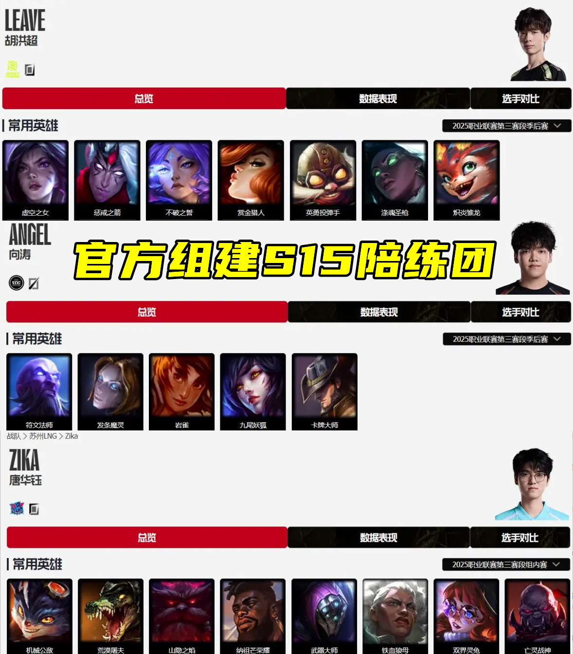 对此,官方也是十分重视,在第三赛段就有传出组建S15陪练团的消息,而如今也是从不少选手口中得到了证实。就知情人士的爆料来看,目前S15陪练团目前是请到了S11的冠军教练茂凯带队,AD选手为Leave,中单选手为Angel,上单暂定Zika。原本打野位置有邀请杰杰,但因为杰杰有理疗行程,并且还有S15开赛的观赛仪式,行程存在冲突,所以没能加入此次陪练团。