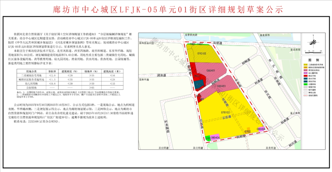 公示时间为2025年9月30日到2025年10月29日。公示方式包括3种,一是现场公示,LFJK-05单元01街区详细规划草案公示地点为科顺道南侧、华祥路西侧;LFJK-05单元04街区详细规划草案公示地点为科顺道南侧、华祥路西侧;LFJK-09单元04街区详细规划草案公示地点为北凤道北侧、东安路东侧;LFJK-11单元01街区详细规划草案公示地点为汇源道南侧、东环路东侧;二是规划展示馆公示,地点为廊坊规划展示馆;三是网络公示,地点为廊坊市自然资源和规划局门户网站。若公众有合理化意见建议,请于2025年10月29日17:30前将书面材料递交廊坊市自然资源和规划局(广阳区广阳道39号),逾期不报视为放弃上述权利。联系电话:2232168(正常办公时间)。