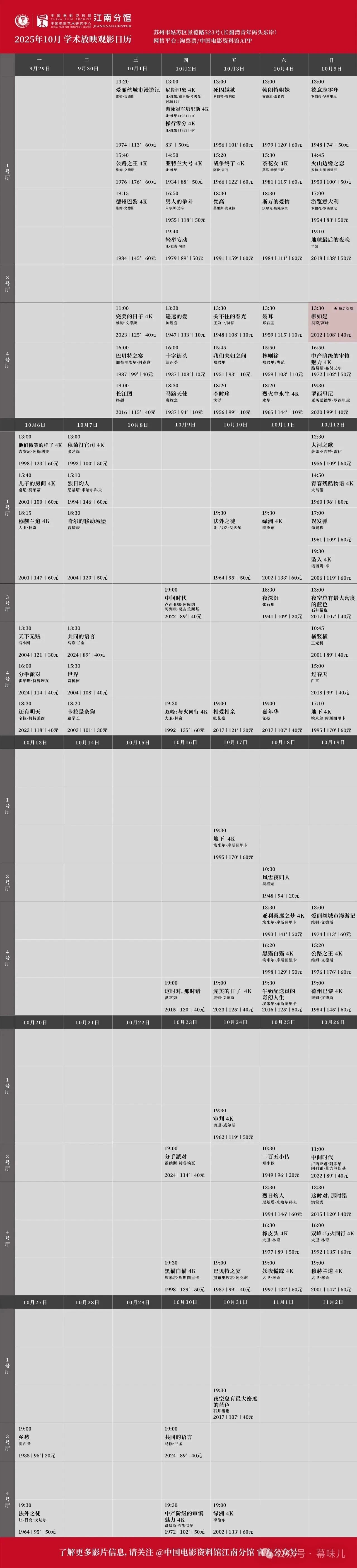 苏州、北京10月放映均已开票;另外,苏州“致敬经典·国际修复电影展”已定档10月18日,节后公布排片;全国艺联“影像之灯”新一季影展将在10月下旬靓丽展开,让我们期待国庆假期后的精彩放映。