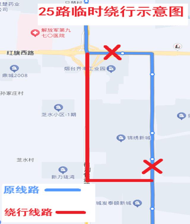 接相关部门通知,受红旗西路(德润路至电厂东路路段)封闭施工影响,即日起,7路、25路、33路、38路临时绕行,具体方案如下: