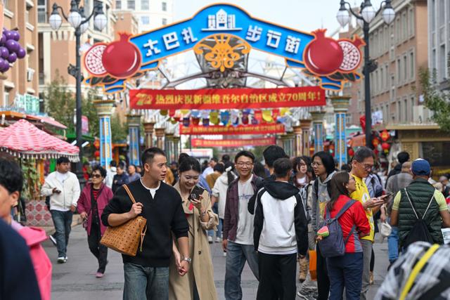 10月1日,位于新疆乌鲁木齐市的新疆国际大巴扎处处洋溢浓厚节日氛围,人们在欢声笑语中尽享节日欢乐,感受新疆魅力。新华社记者 丁磊 摄影报道