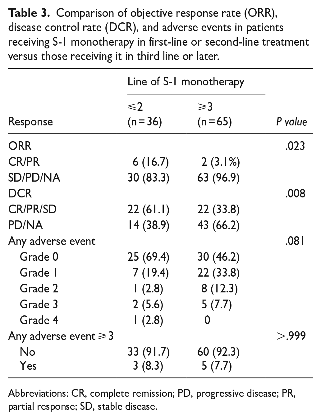 与三线及以上治疗相比,一线或二线S-1治疗显著提升ORR(16.7% vs 3.1%,P=0.023)、DCR(61.1% vs 33.8%,P=0.008),延长PFS(4.2个月 vs 2.3个月,P<0.001)、OS(8.8个月 vs 4.7个月,P=0.07)。此外,与三线及以上治疗相比,这两组患者在不良事件及3级或更严重不良反应的发生率上无显著差异。