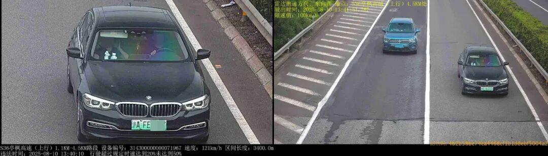 ▲2025年8月10日13时40分,号牌为沪AFE5***的小型轿车在S36亭枫高速(上行)1.1KM-4.5KM路段,实施了“驾驶校车、中型以上载客载货汽车、危险物品运输车辆以外的机动车在高速公路上行驶超过规定时速百分之二十以上未达到百分之五十的”违法行为。