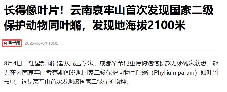 红星新闻《长得像叶片!云南哀牢山首次发现国家二级保护动物同叶䗛,发现地海拔2100米》2025-08-04