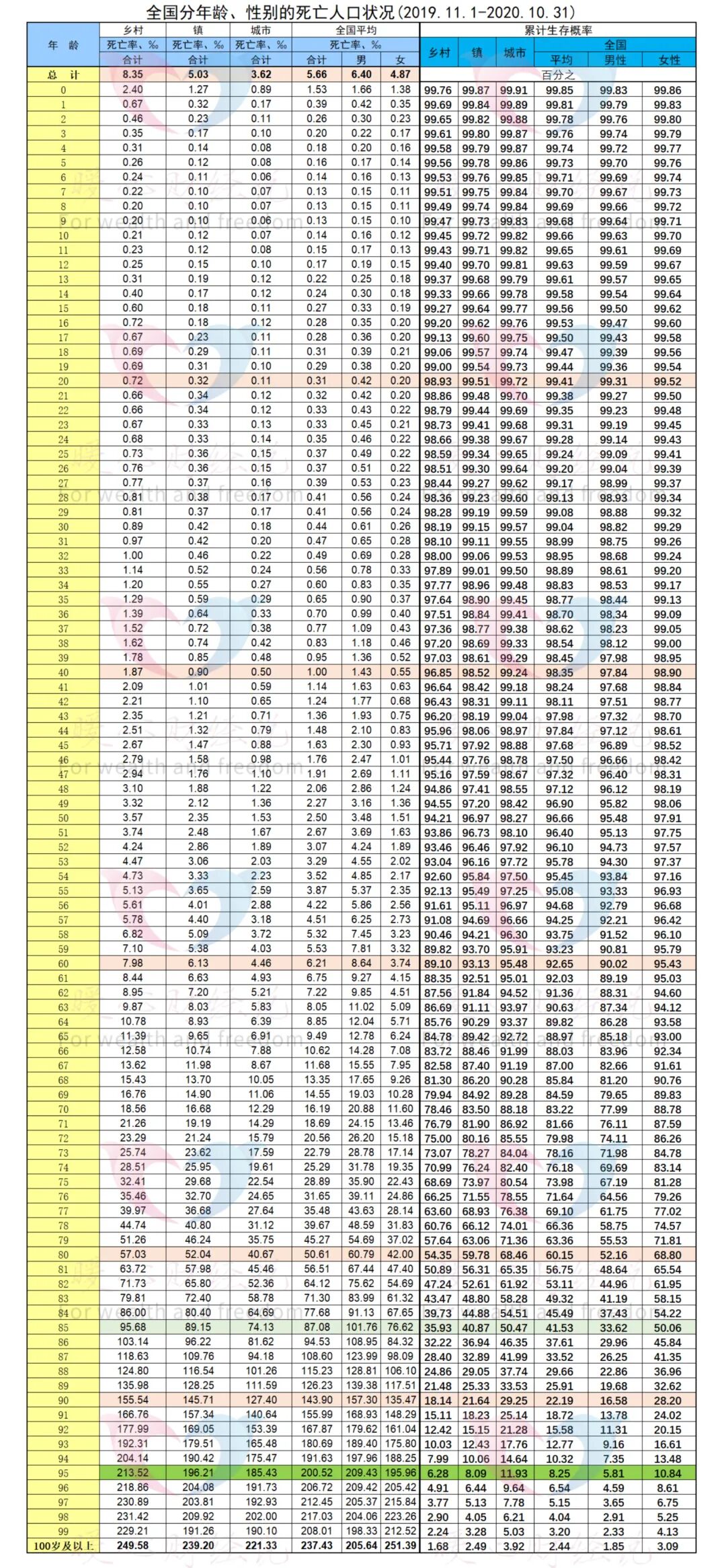 关于这个死亡率数据,暖心仔细分析以后确实也有点跟实际偏颇。人口普查公布的死亡率为千分之5.66,死亡总人数是796.6万。而国家统计局经过明确精算分析,公布的死亡人数是998万人,两者相差201.4万人。所以说,下表中的实际死亡率应当是更高一些的,因此人们活到50岁的概率相对会低一些。