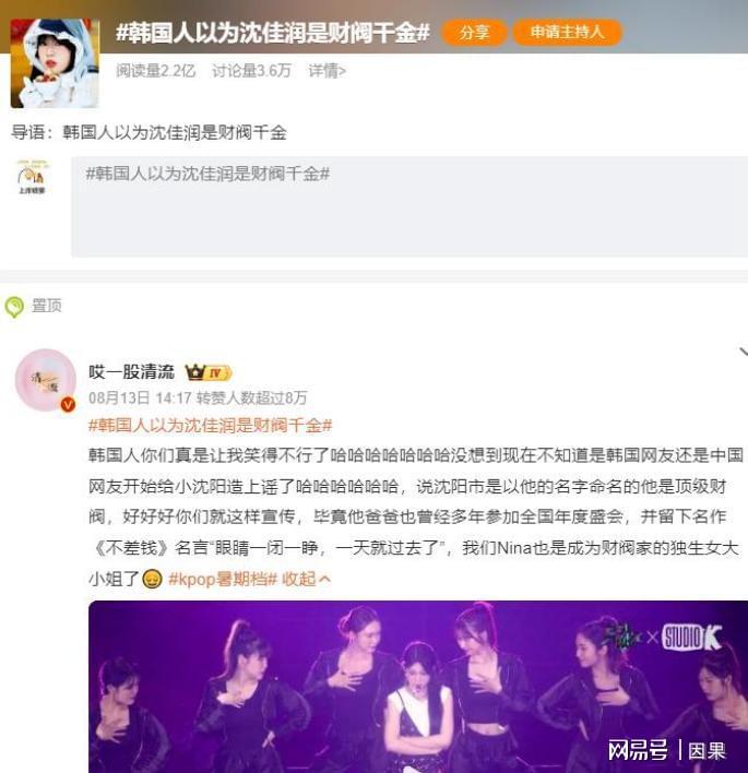 她父亲小沈阳不是和沈阳的地名撞了吗,然后在韩国人眼里她的父亲就成了一个地区的财阀了。