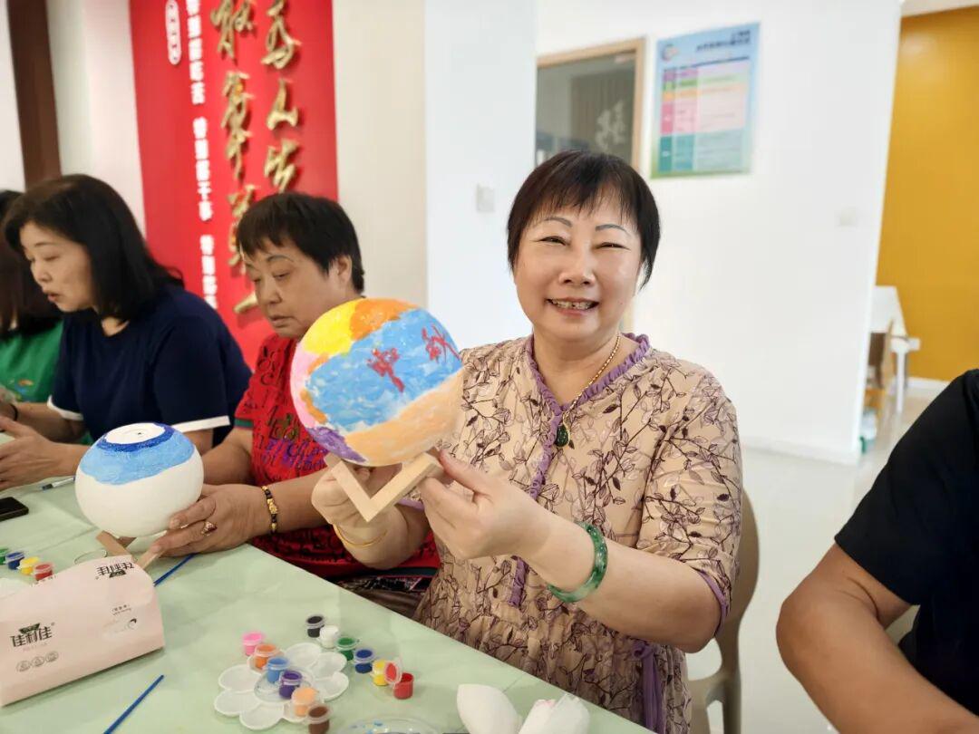 在青村镇志愿者服务中心的活动室里,青年志愿者们耐心指导居民们给月亮灯涂上各种颜色,创造属于每个人的“专属月亮”。