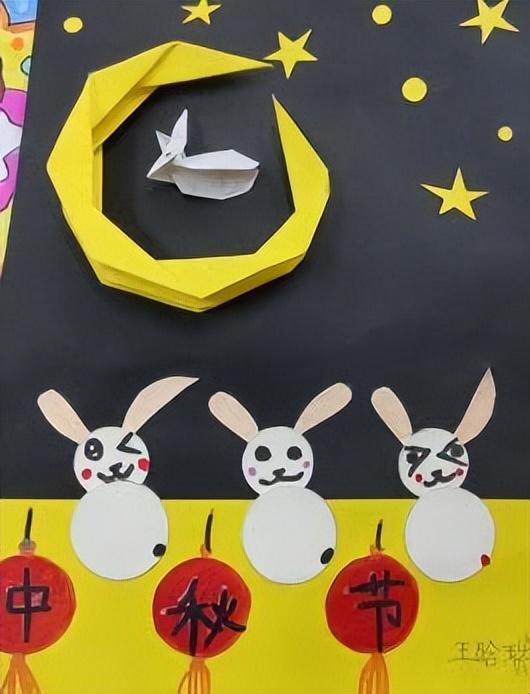 如果说手势舞是"动起来的中秋",那么绘画展则是"定格的浪漫"。教室走廊的展板上,挂满了孩子们的作品,每一幅都像打开了一个童趣满满的中秋童话。有的孩子把月亮画成金灿灿的圆盘,周围绕着星星和飘带,"我想让月亮照着所有人回家团圆";有的画了全家围坐餐桌,桌上摆着月饼、螃蟹,连小狗都趴在脚边等投喂;还有的用黏土做了立体玉兔,圆滚滚的身子、长长的耳朵,仿佛下一秒就要蹦起来。稚嫩的文字配上鲜艳的色彩,让人瞬间被这份童真打动。