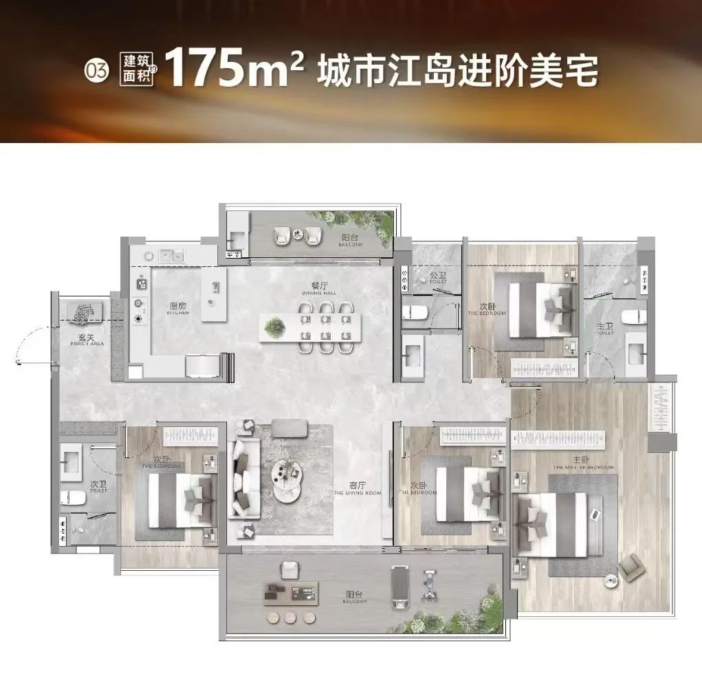 同样的南北双阳台3卫设计,空间更阔绰,尤其是主卧,尺度更大。