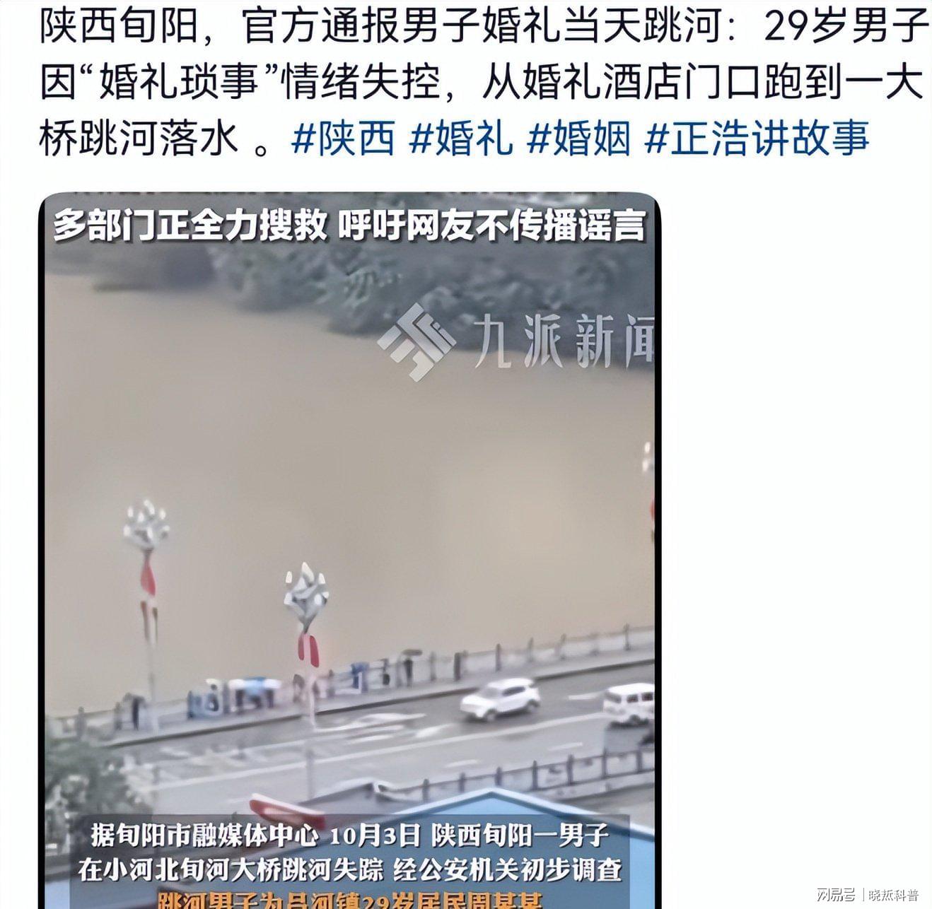 陕西安康旬阳,二十九岁的新郎周某阳在婚礼当天跳河失踪。