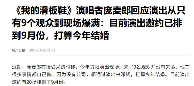 杭州日报 2025-04-28 《我的滑板鞋》演唱者庞麦郎回应演出从只有9个观众到现场爆满:目前演出邀约已排到9月份,打算今年结婚