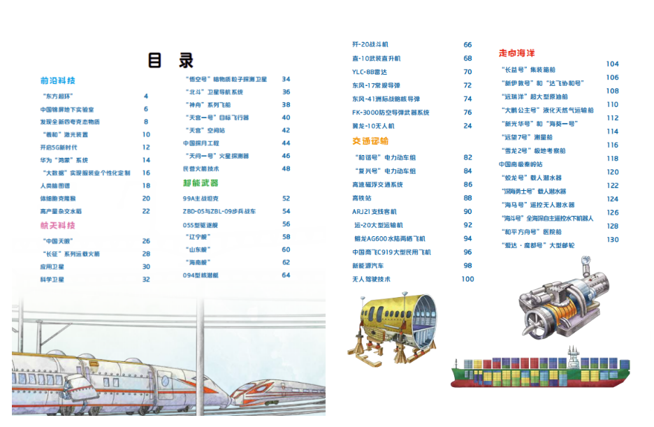 除了航天科技的知识,《中国儿童图解百科·了不起的中国科技》内容还涵盖前沿科技、超能武器、交通运输、走向海洋这四个部分,聚焦科技前沿的最新成果和重大进步。这五部分共60个主题,500多幅图片,600余个知识点,配以各种剖面图、解析图、原理图、结构图、细节图,图文并茂,给少年儿童呈现出国之重器背后的奥秘和科学知识,让他们在轻松愉快的阅读中,感受祖国的强大和科技的魅力。