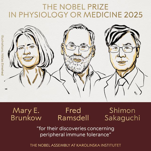 当地时间10月6日,瑞典卡罗琳医学院宣布,将2025年诺贝尔生理学或医学奖授予科学家玛丽·E·布伦科(Mary E. Brunkow)、弗雷德·拉姆斯德尔(Fred Ramsdell)和坂口志文(Shimon Sakaguchi)。