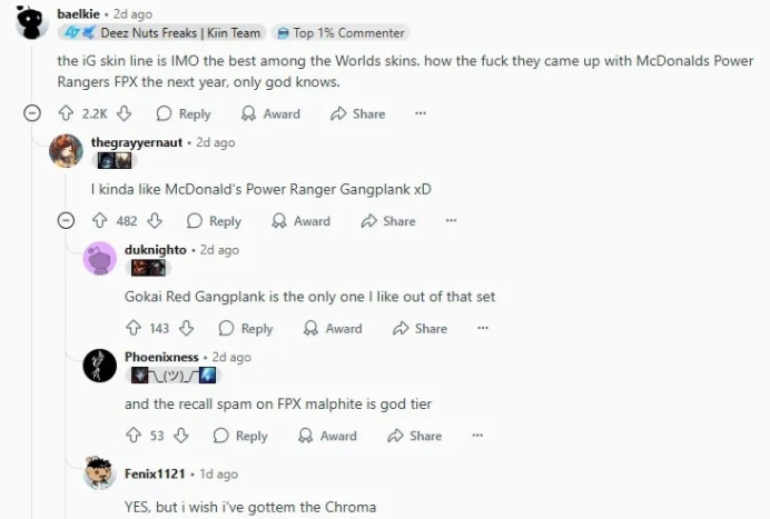 但仅仅从美术角度来解释,还不足以说明为什么其他冠军皮肤没能进入前100,更深层的原因在于玩家群体对战队和历史的情感认同,2018年iG的夺冠,是 LPL 赛区的第一个世界冠军,这不仅是一个战队的荣耀,更是中国《英雄联盟》玩家多年等待的圆梦时刻,那一年,无数玩家通过直播见证了这一瞬间的历史意义,于是,iG卡莎不再只是一款皮肤,而是“LPL首冠”的象征,凝聚着玩家们的集体情绪,国外网友的评价“看到这款皮肤就会想到iG战队”,正好印证了这种情感的附加值。