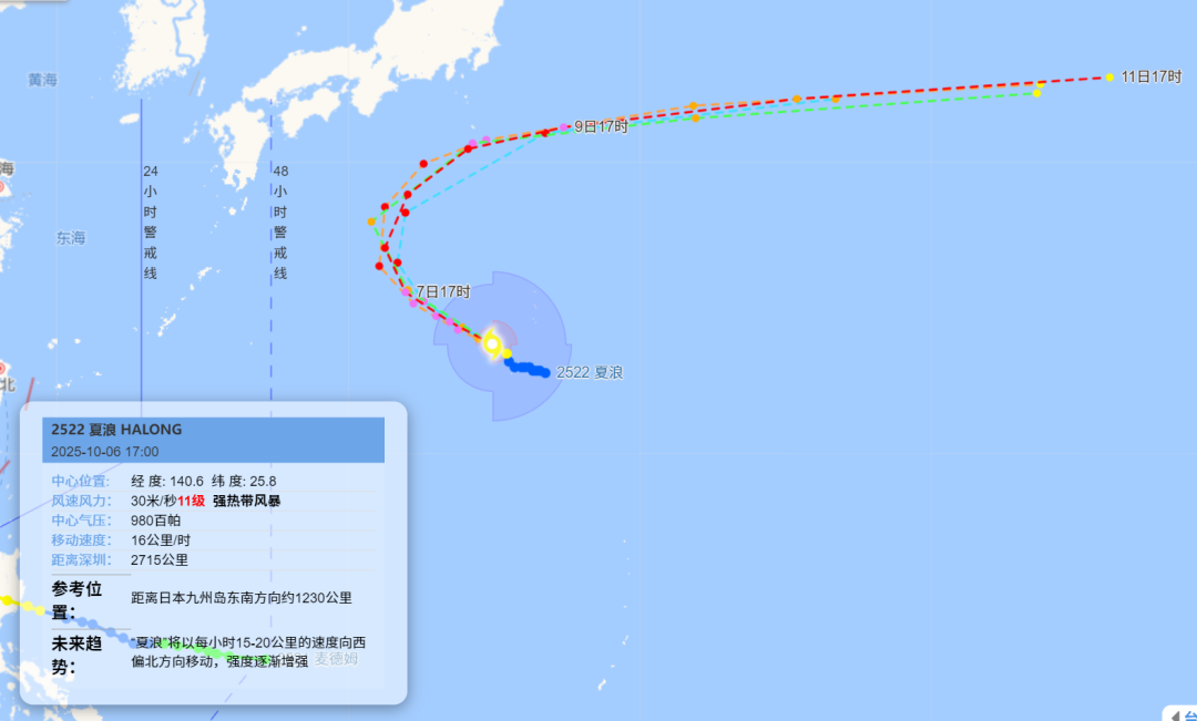 预计,“夏浪”将以每小时10-15公里的速度向西偏北方向移动,强度逐渐增强。未来“夏浪”对我国海域无影响。