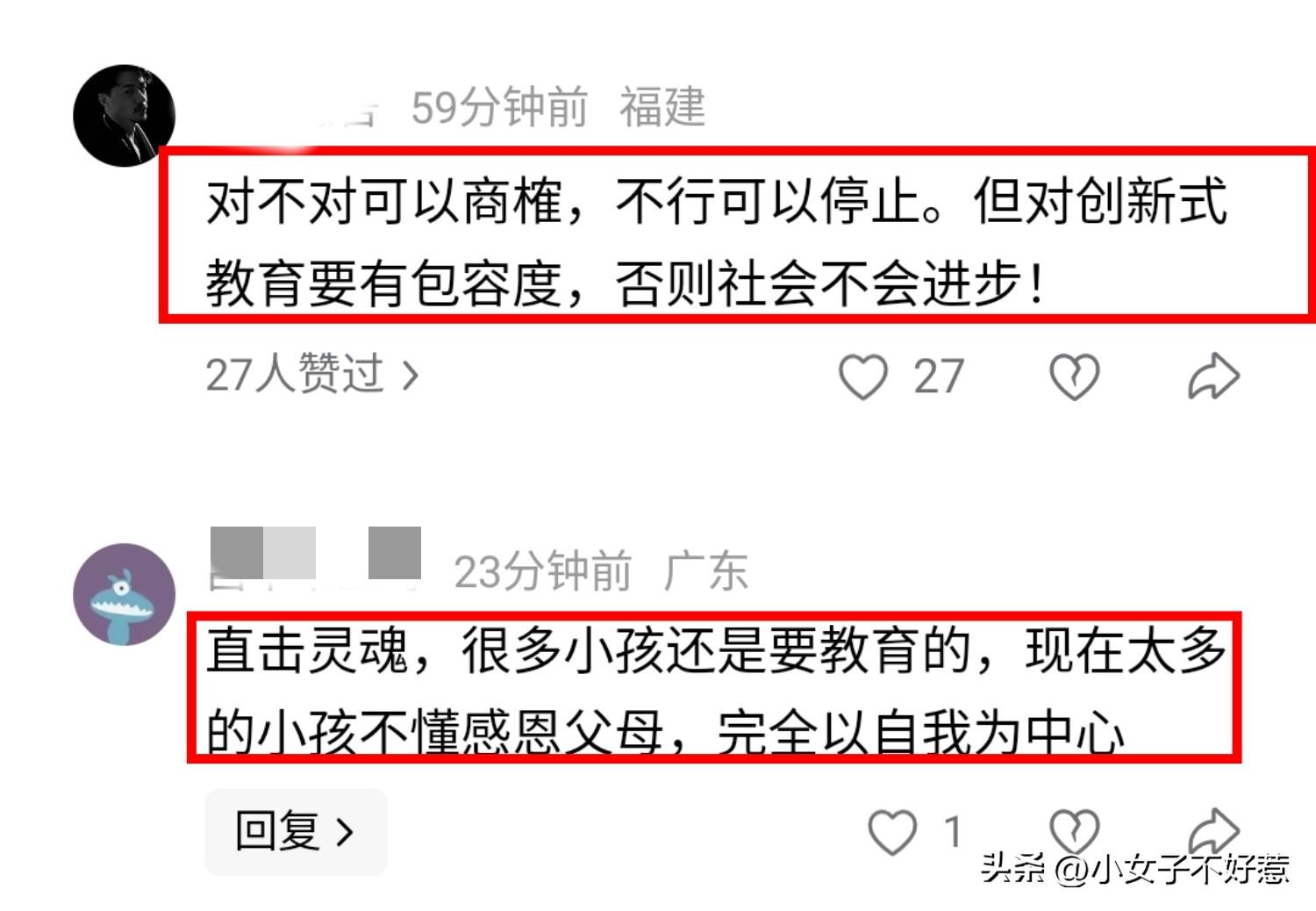但也有的网友持有不同的意见,说这个活动是创新,对不对可以商榷,不行就停止,对创新式教育要有包容度,还放大到社会进不进步上去,个人不敢苟同。还有的说现在的小孩不懂感恩父母,完全以自我为中心,这样的活动更能直击灵魂。这个说法我就更不敢苟同了。