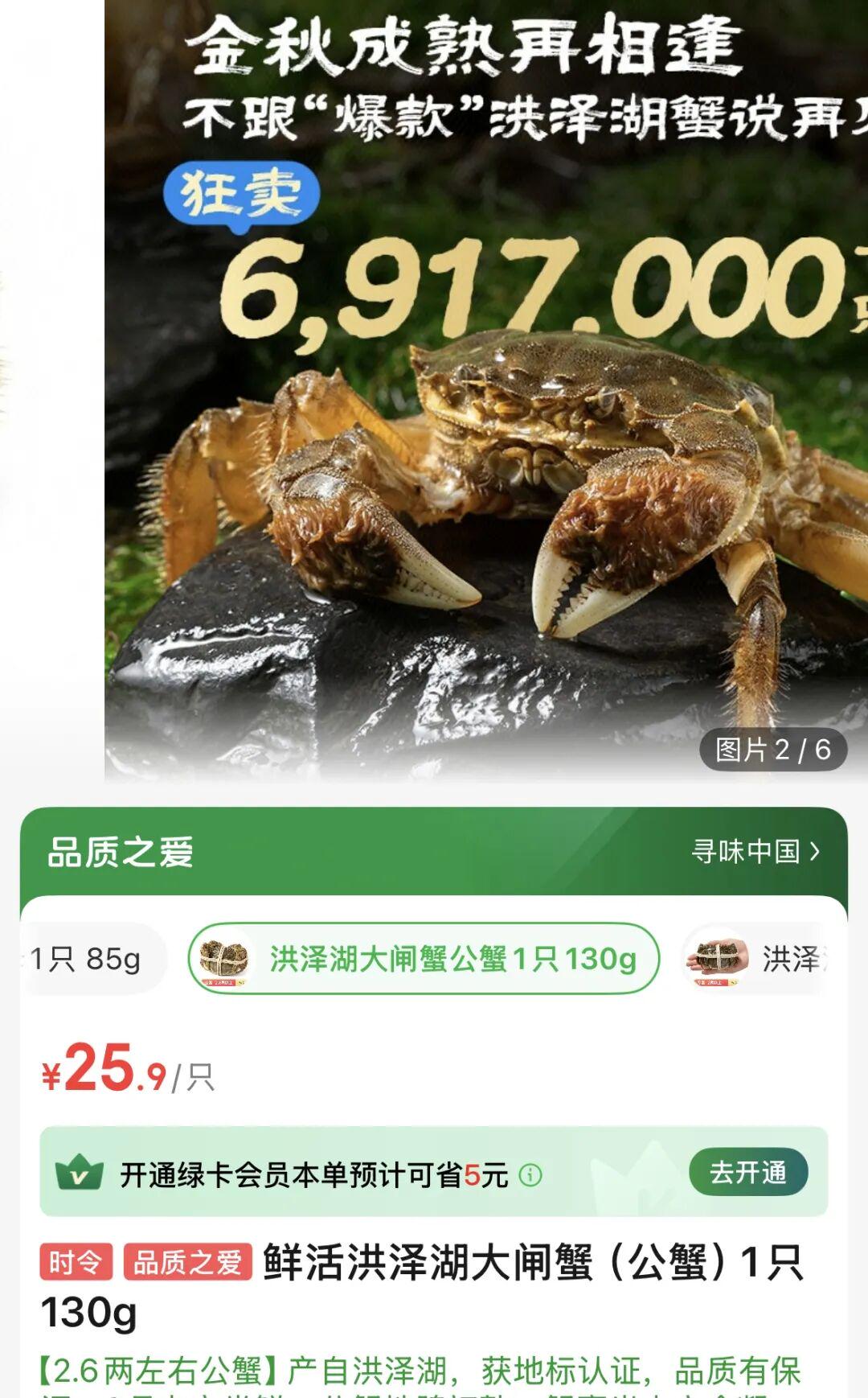 130克的洪泽湖大闸蟹(公蟹)的价格为25.9元/只