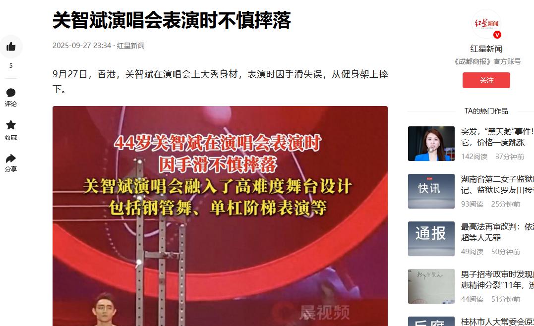 9 月 27日,香港知名男星关智斌在演唱歌曲时竟意外失足。