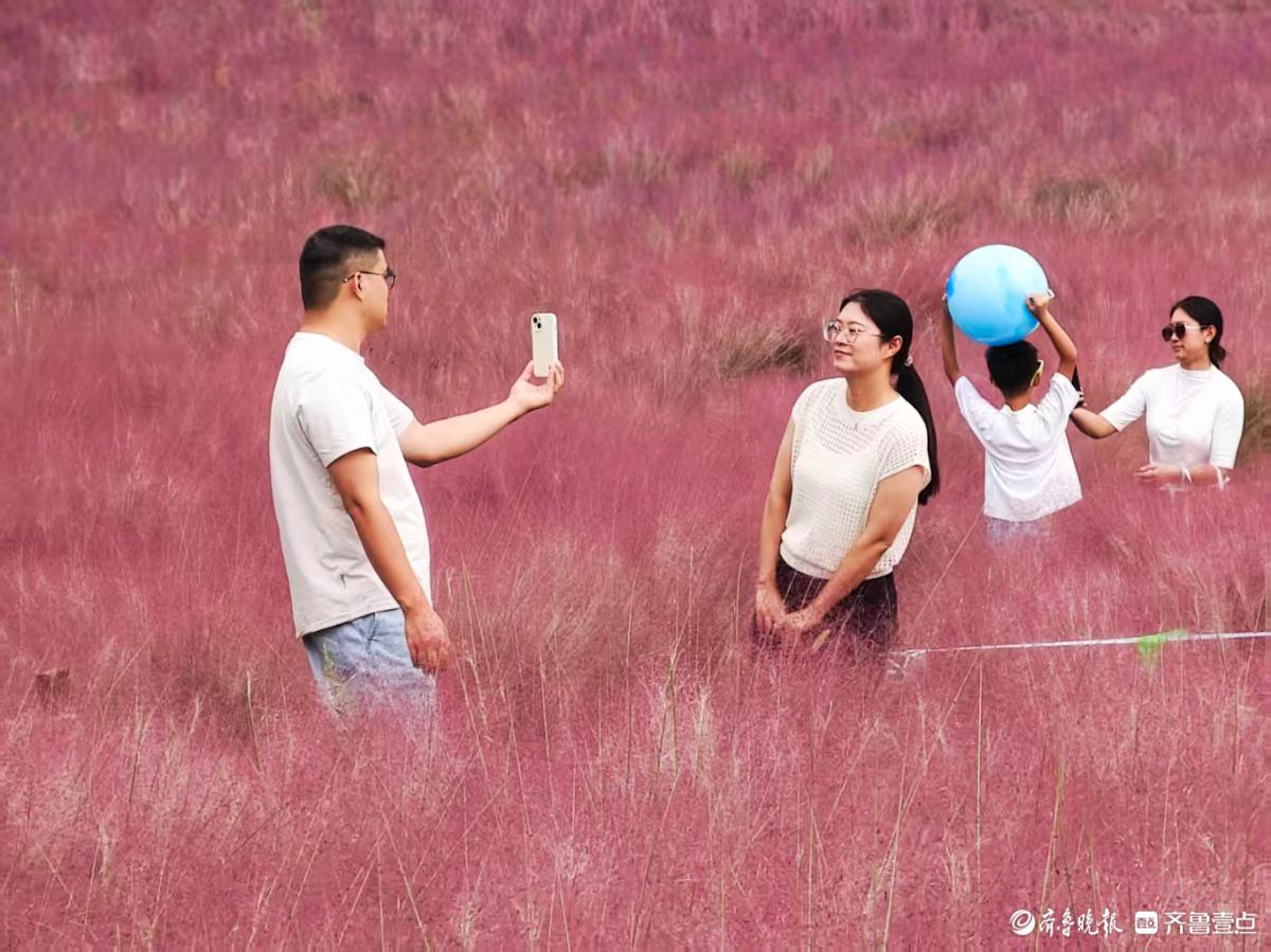 10月6日,在临沂河湾公园沂河岸边,粉黛乱子草花儿竞相绽放,吸引了众多游客纷至沓来,纷纷拍照留存美好瞬间。远远望去,那一片片粉红花海,如袅袅云烟,似绚丽锦霞,格外引人注目。 高军 摄