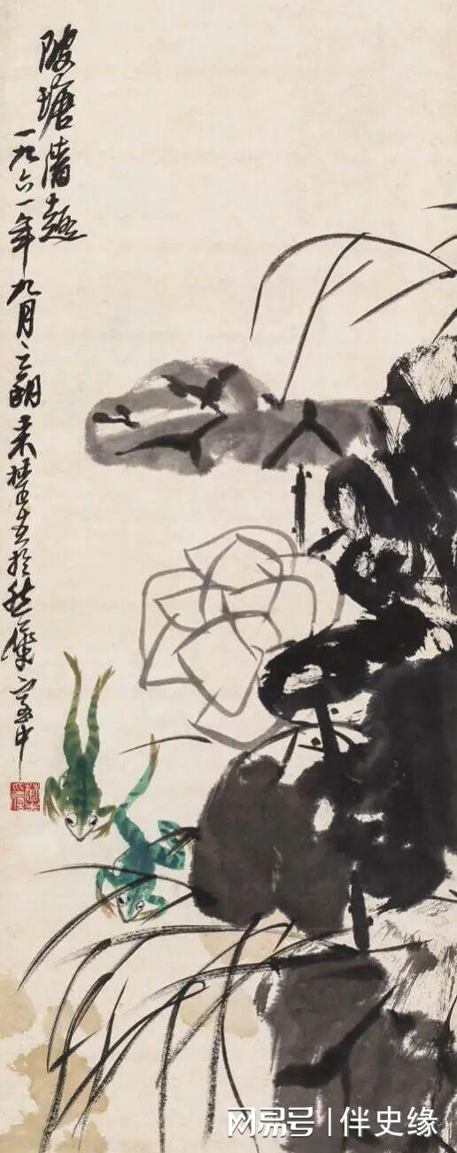 像他六七十年代画的《荷塘清趣》,水草、荷叶、荷花争先恐后,两只小青蛙从左侧跳出,大写意两三笔就勾勒出青蛙的身体。