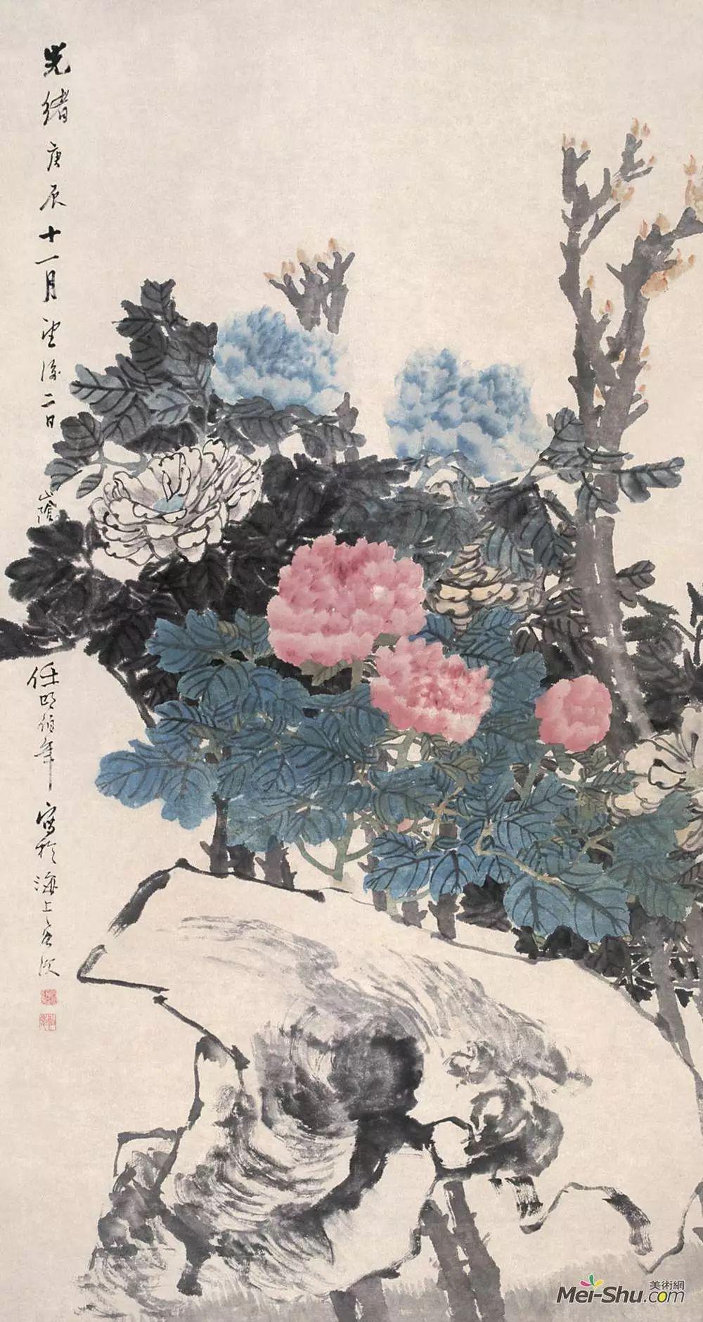 任伯年 牡丹猫石图 立轴 纸本 设色 1872年 苏州博物馆藏
