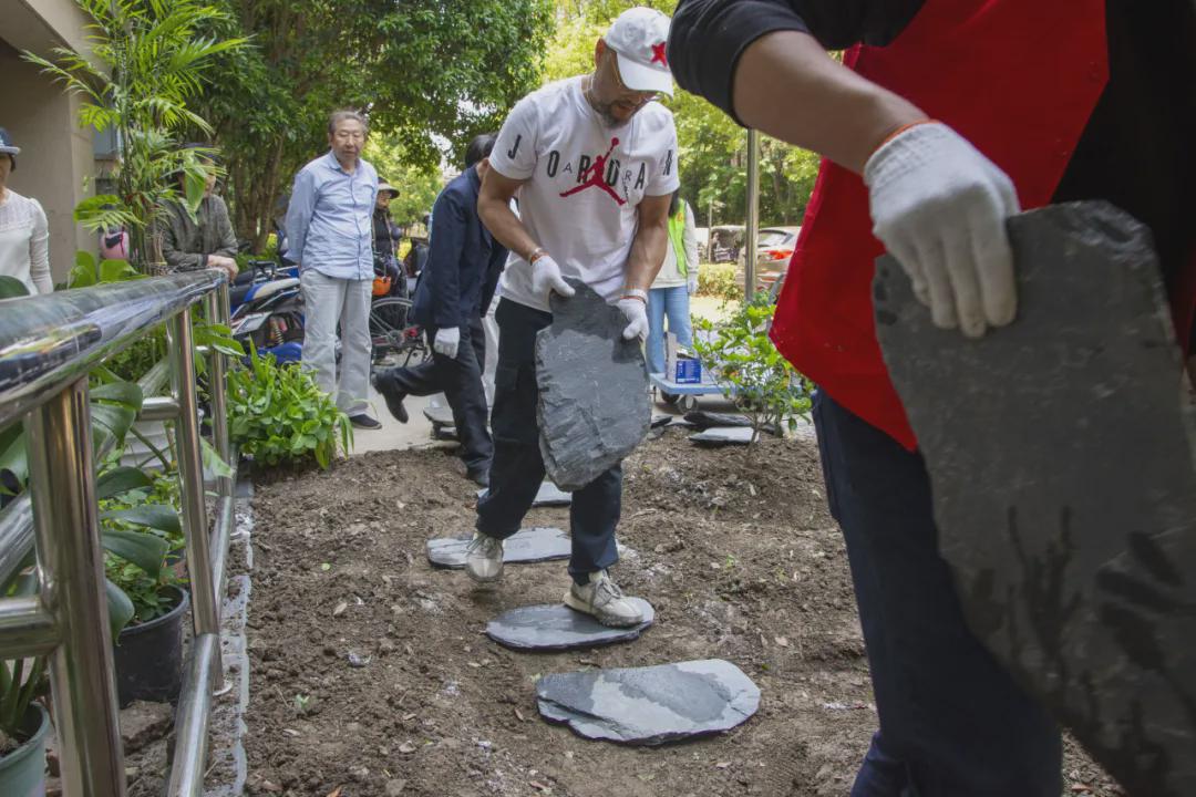 施工当天,现场热火朝天。“往左挪一点,和前一块齐平才好看!”年轻小伙搬石板,细心的居民阿姨在后面帮忙调整位置。学生志愿者们捧着花苗,小心翼翼地放进挖好的土坑……在大家的齐心协力下,一座精致的小花园在众人眼前完美落成。