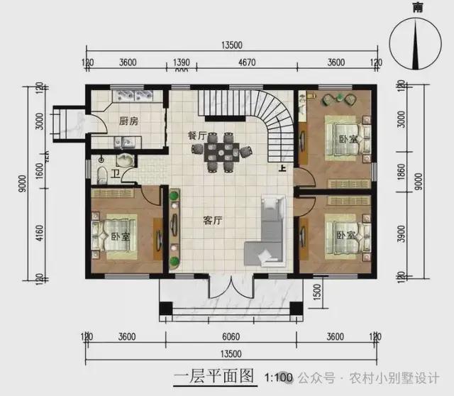 13.5米×9米二层别墅农村自建房设计户型图+效果图7个卧室,2个卫生间,厨房,一餐厅,一客厅,一起居室,一阳台