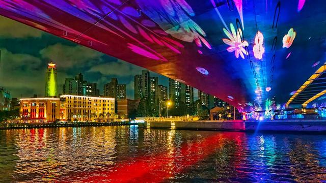 武宁路桥在节假日有水幕瀑布和灯光字样时格外上镜,桥下往来的人群与灯光,也为画面增添了生活气息。